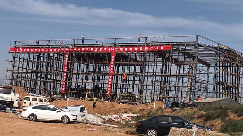 寧夏公司在中外建華設計院的配合下,於8月17日在短短4天的時間做出了整體方案圖及結構施工圖紙設計并通過了甲方的審核和認可并得到了一致的好評。這個項目要由四個專業隊伍來完成即土建基礎、鋼結構主體、外垟夾心板及幕墻、室內裝修、水電及智能投影功能。同時;要完成室外2萬平米的廣場。工程位於草原腹地。沒有道路,自己建2公里臨時便道,沒有水用車拉,沒有電用柴油發電機。沒有隊伍從徐州組織鋼結構隊伍,從寧夏組織裝修隊伍及強電弱電隊伍,在當地組織土建和機械隊伍。在沒有條件創造條件也要上,保證開工典禮使用,發揚中煤百甲精神。以武漢雷神山速度為榜樣。保證十八天完成任務的精神鼓舞下。寧夏公司全力以赴,總經理劉劍將有限的資金全部投入。公司屈徐平付總經理整體規劃、調動組織資源,日夜操勞。項目部經理魯年富發揚敢打硬仗,奮勇拼搏的精神。有效組織施工,日夜兼程吃住在現場。組織了施工機械40余臺其中有山推、挖機、鏟車、吊車、發電機、泵車等進行場地平整基礎開挖和澆筑混凝土,組織施正人員150余人不分白天晝夜而且是不同工種同時作業,號稱“百人大會戰”。在全體參戰人員的努力下,於9月20日按期完成竣工。交了內、外高檔裝修,室內功能齊全,同項目投資標準相適應高大尚的展示廳和滿足開工典禮使用的會議廣場。以從開工到竣工創造了十八天完成的中煤百甲公司的雷神山速度和精品工程。得到了參加領導和業主的大力贊賞和表揚。